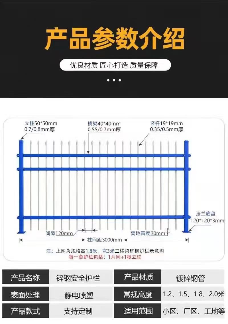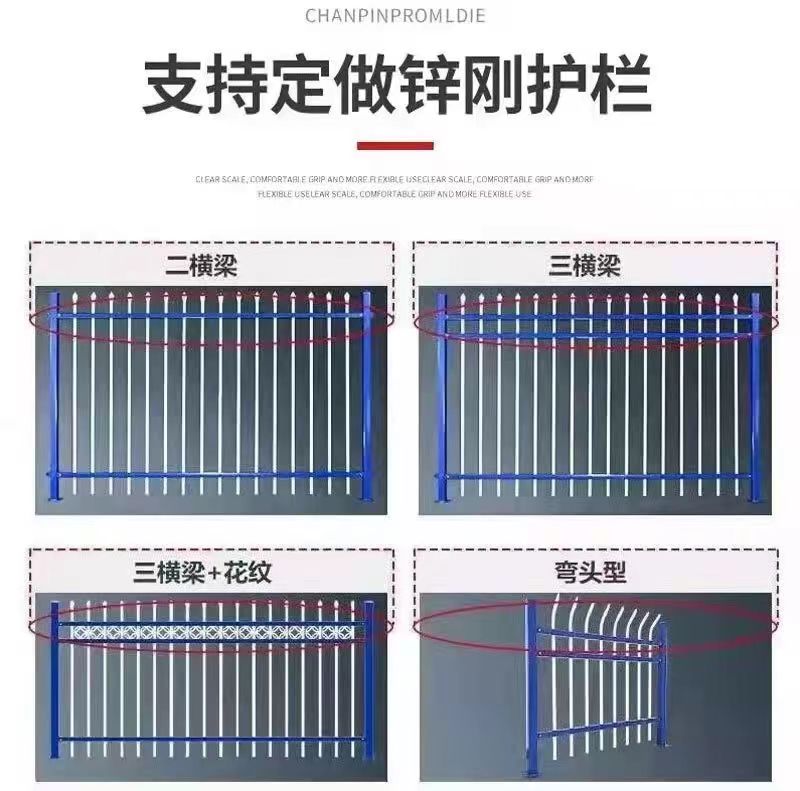 鋅鋼護欄 Zinc steel Fence 是指采用鋅合金材料制作的用于不同部位、具備不同功能性的圍護欄桿,由于其后期是用靜電噴涂處理表面層,使具有高強度、高硬度、外觀精美、色澤鮮艷等優點,成為住宅小區、工廠院校、道路交通等使用的主流產品。傳統的護欄使用鐵條材料,需要借助電焊等工藝技術,而且質地較軟、容易生銹、色彩單一。鋅鋼陽臺護欄完美地解決了傳統護欄的缺點,而且價格適中,成為傳統各式護欄材料的替代產品。鋅鋼護欄采用無焊穿插組合方式進行拼裝(也有工藝需要局部焊接,但要在噴涂前做補鋅處理),基材厚度是不銹鋼的2-3倍,500多種顏色可供選擇,表面采用聚酯抗氧化粉末靜電噴涂,增強了護欄的抗氧化抗紫外線、耐候耐腐能力。以鋅鋼為基材,用在建筑護欄中的產品具體的主要有:陽臺護欄、防護窗、樓梯扶手、柵欄、花園圍欄、百葉窗、空調圍欄、道路護欄。工業用圍欄(如廠區圍欄、商業場地圍欄)、農業用圍欄(如田地圍欄,畜牧圍欄)、民用圍欄(如建筑物頂圍欄,圍欄墻等)、公共設施圍欄(如道路隔離欄)等等。 使用比較廣泛。